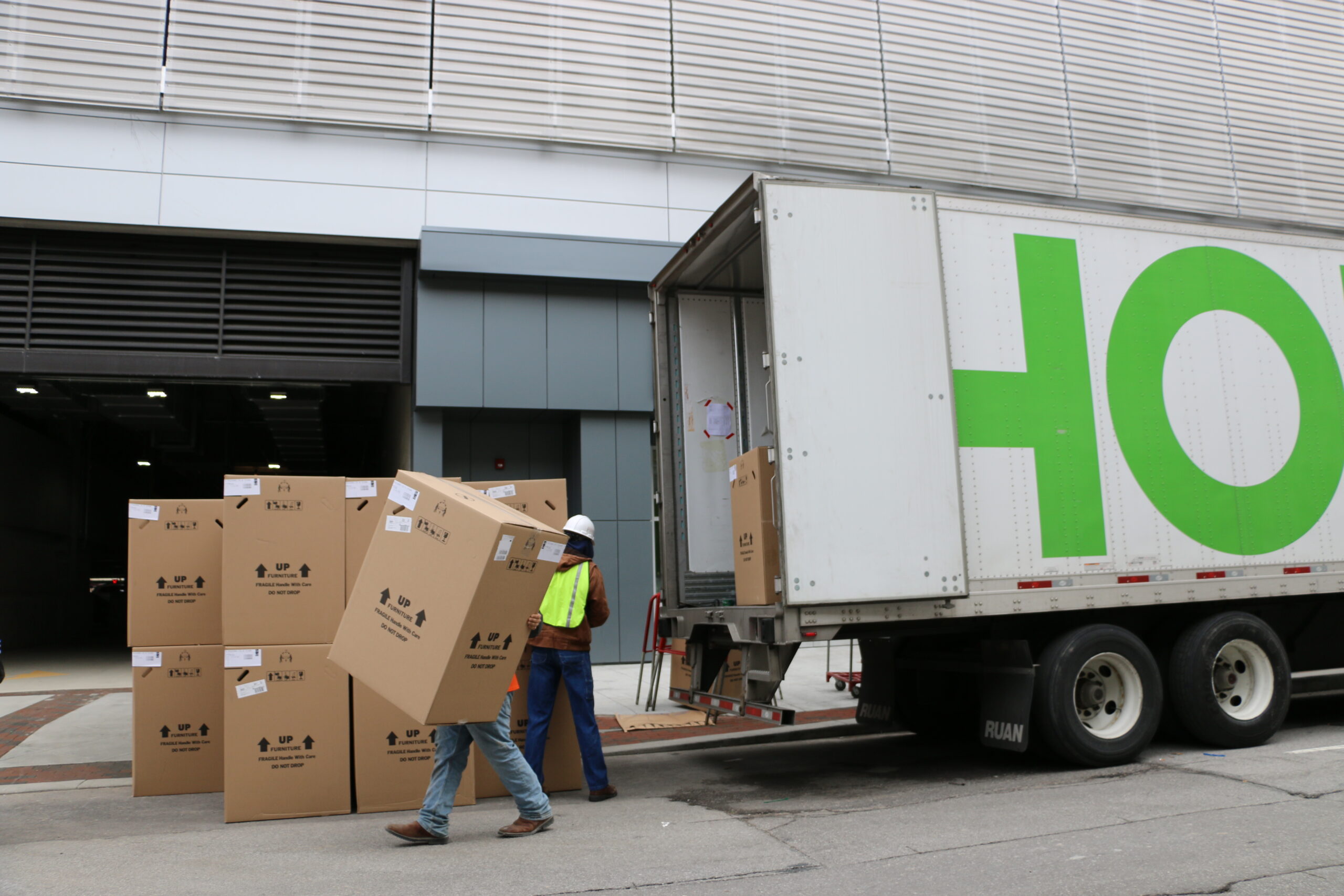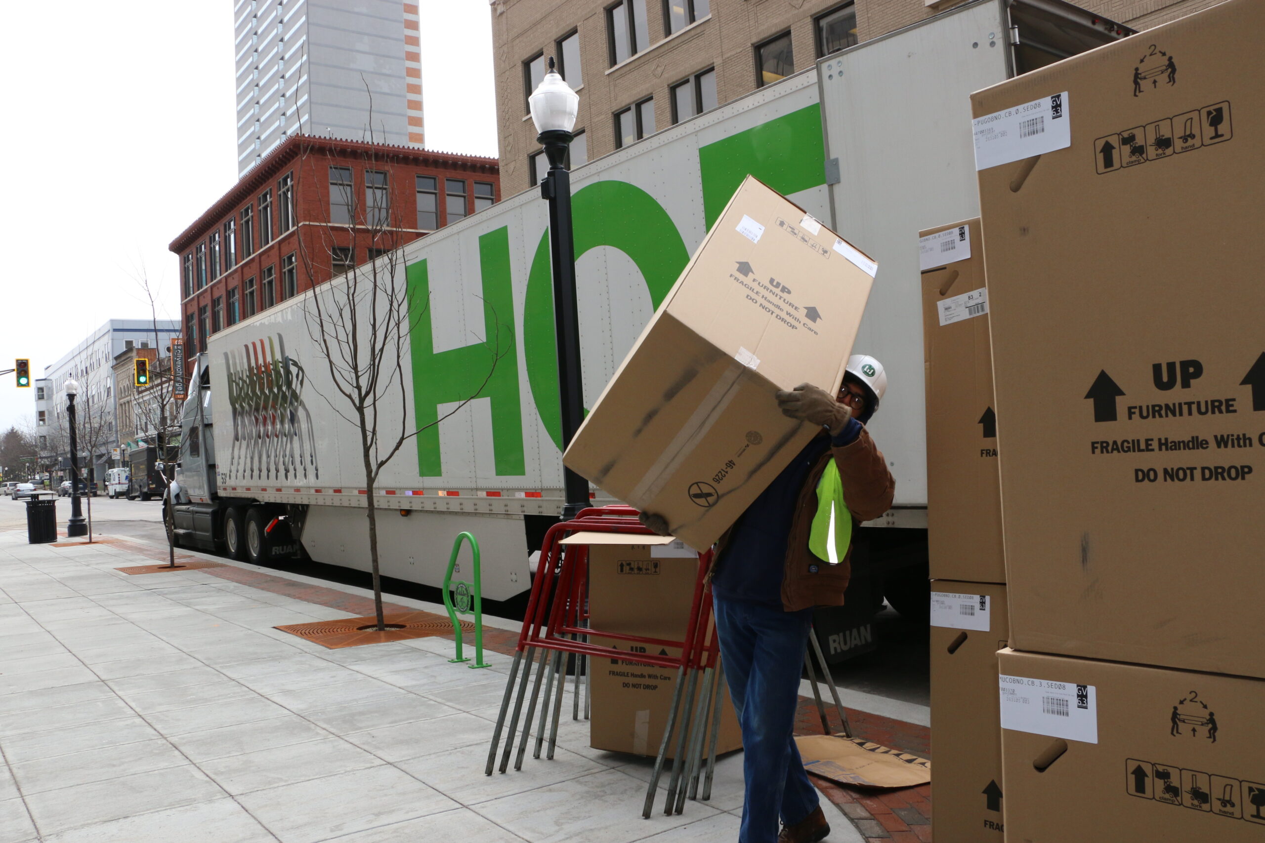 It’s furniture moving day! After months of work on the Ash Skyline Plaza in Fort Wayne, the day is finally here that we start moving in office furniture. We’re out at the new building unloading trucks full of office furniture. We will be installing furniture for Ash Brokerage on the 7th and 8th floor. We’re very excited to be a part of this project that’s been months in the making. Check back to see the progress on the building and the creative use of furniture and office spaces.
