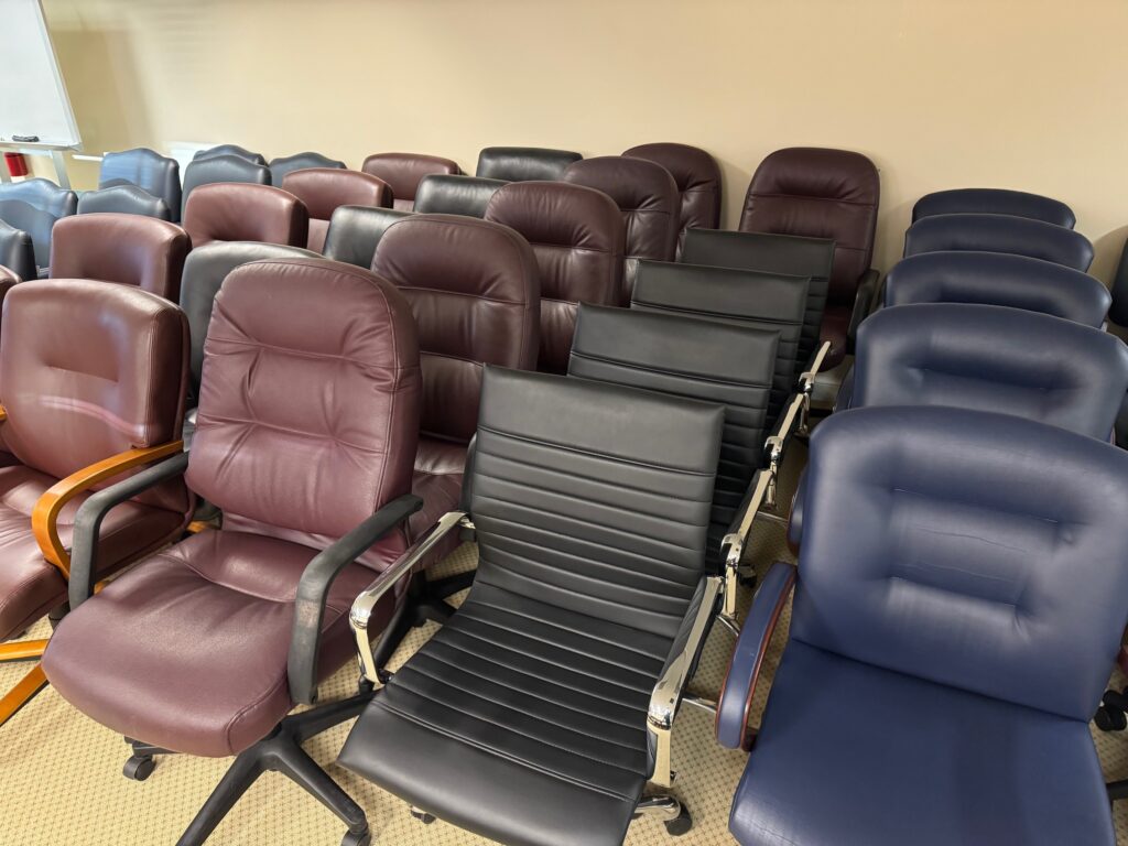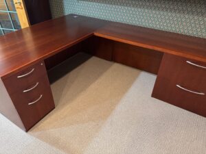 Arc front desk measures 72″ x 36″ – 30″ with a 24″ x 60″ return with a 2 drawer lateral file.