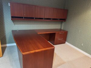 SOLD – Used Gunlocke L-shape desk with wall mounted overhead storage unit and storage tower.